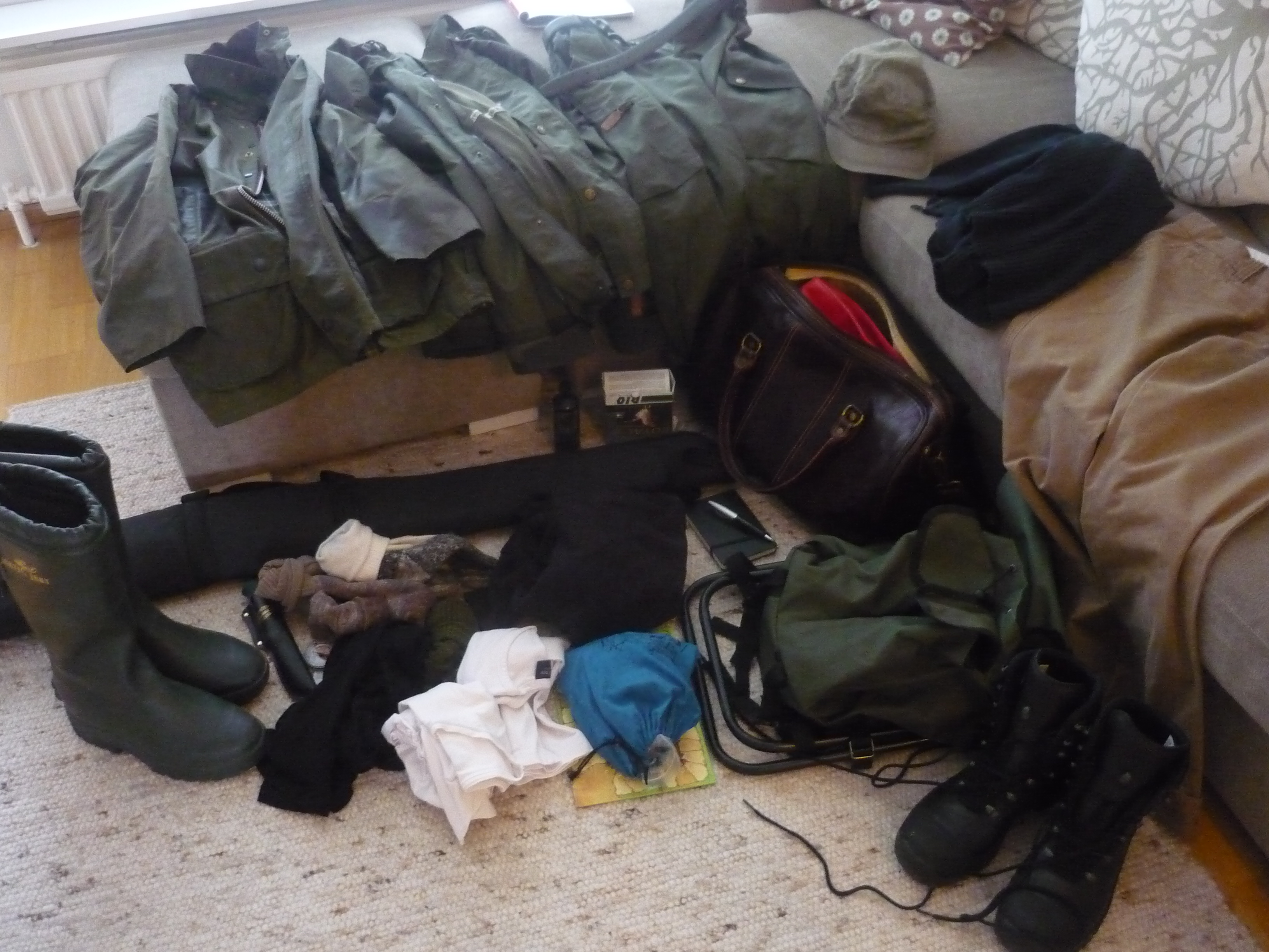 Syksyn kohokohta on edessä. Pakkailen tässä metsäkanalinnustuksen avausta varten. Kuvasta puuttuu ainakin kuksa, termari, matkalukeminen, hirvikärpässuihke, kaikki se minkä muistan viime tingassa ja kaikki minkä unohdan. Kenkien pitäisi olla ruskeat, mutta minkäs teet, löysin noista Haixeista hyvän tarjouksen. Sääksi on luvattu vähän turhan lämmintä. Carcassonne on kaatosadepäivien varalta.