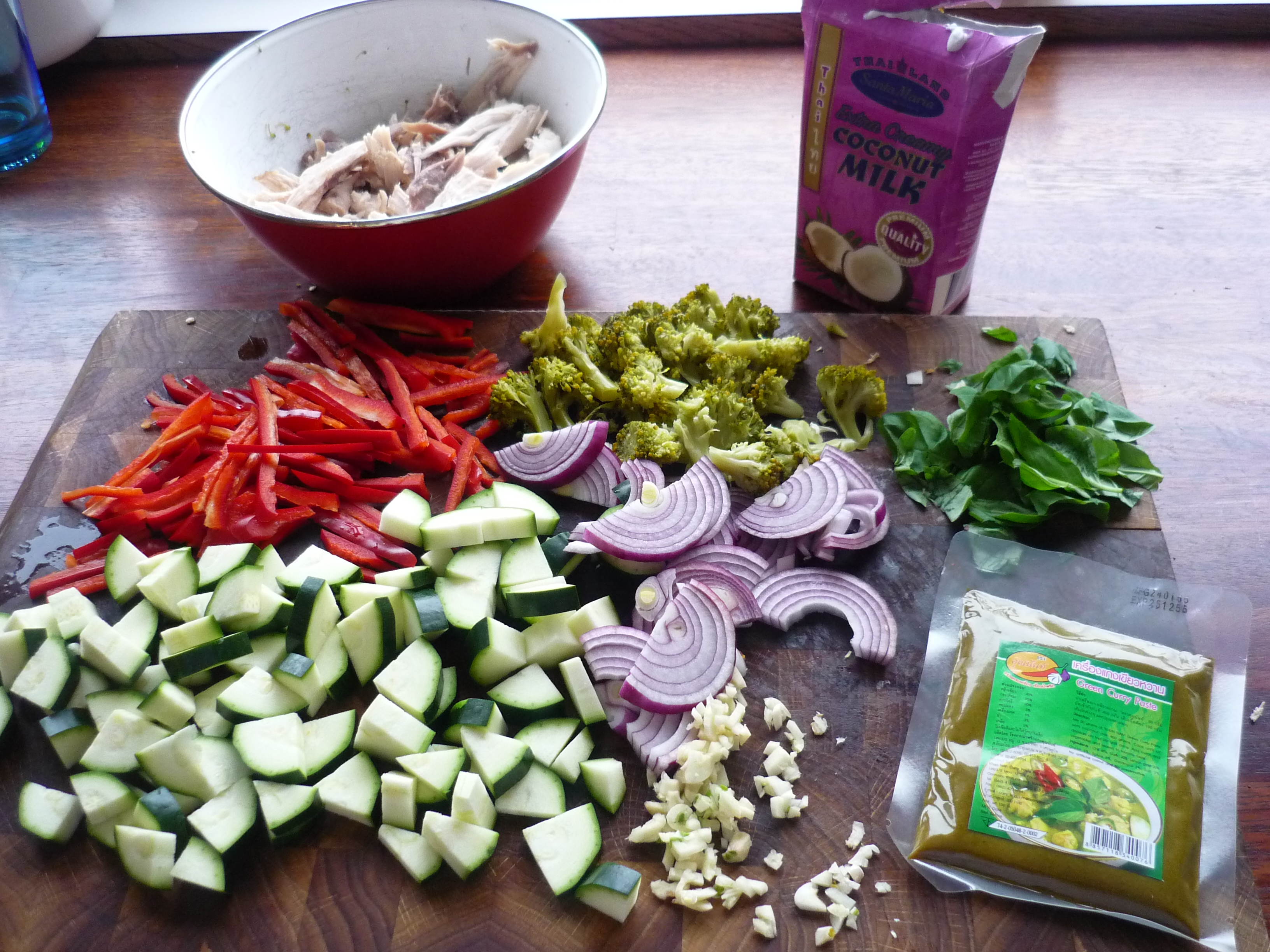 Thairuoka on aasialaisista suosikkini. Tässä on wokkiin menossa kasviksia ja kookoskermaa kokonaisena keitetyn broilerin kanssa. Ja tietysti thai-kalakastiketta. Vihreä valmistahna on Thaimaan-tuliainen.