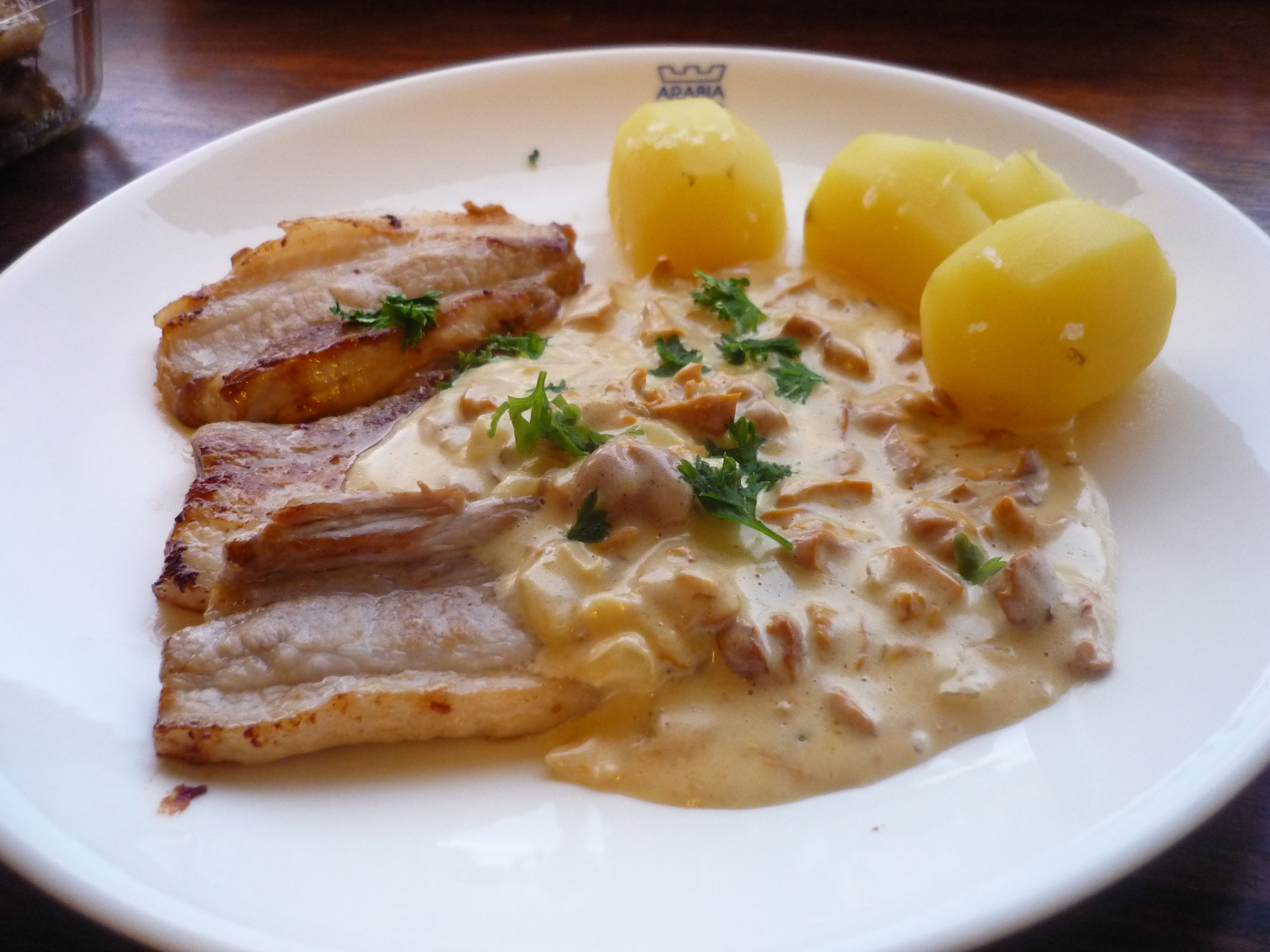 Läskisoosi. Tosin kiitos suomalaisen ruokakulttuurin tuhonneen low fat -ideologian en edes tiedä, miten perinteinen läskisoosi tehdään. Eli oikeasti tämä onkin luomupossunkylkeä ja kantarellikermakastiketta. En ole iso porsaan ystävä, osin siksi, että halvalla tuotettu tehosika maistuu usein jotenkin pistävän stressiseltä. Suuri osuus on varmaankin sian rehulla, joka on viljaa, rypsiä ja soijaa, eli huonointa millä elossa pysyy. Seurauksena sianlihassa on myös turhan paljon omega-6-rasvahappoja. Nykyään saa kyllä jo herkullista porsastakin, ja usein se on luomutuotantoa.