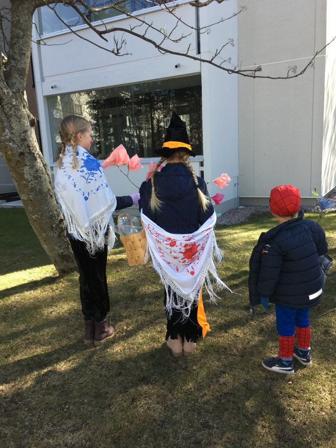 Tytöt pukeutuvat noidiksi, meikataan. Poika on pääsiäis-Spiderman.