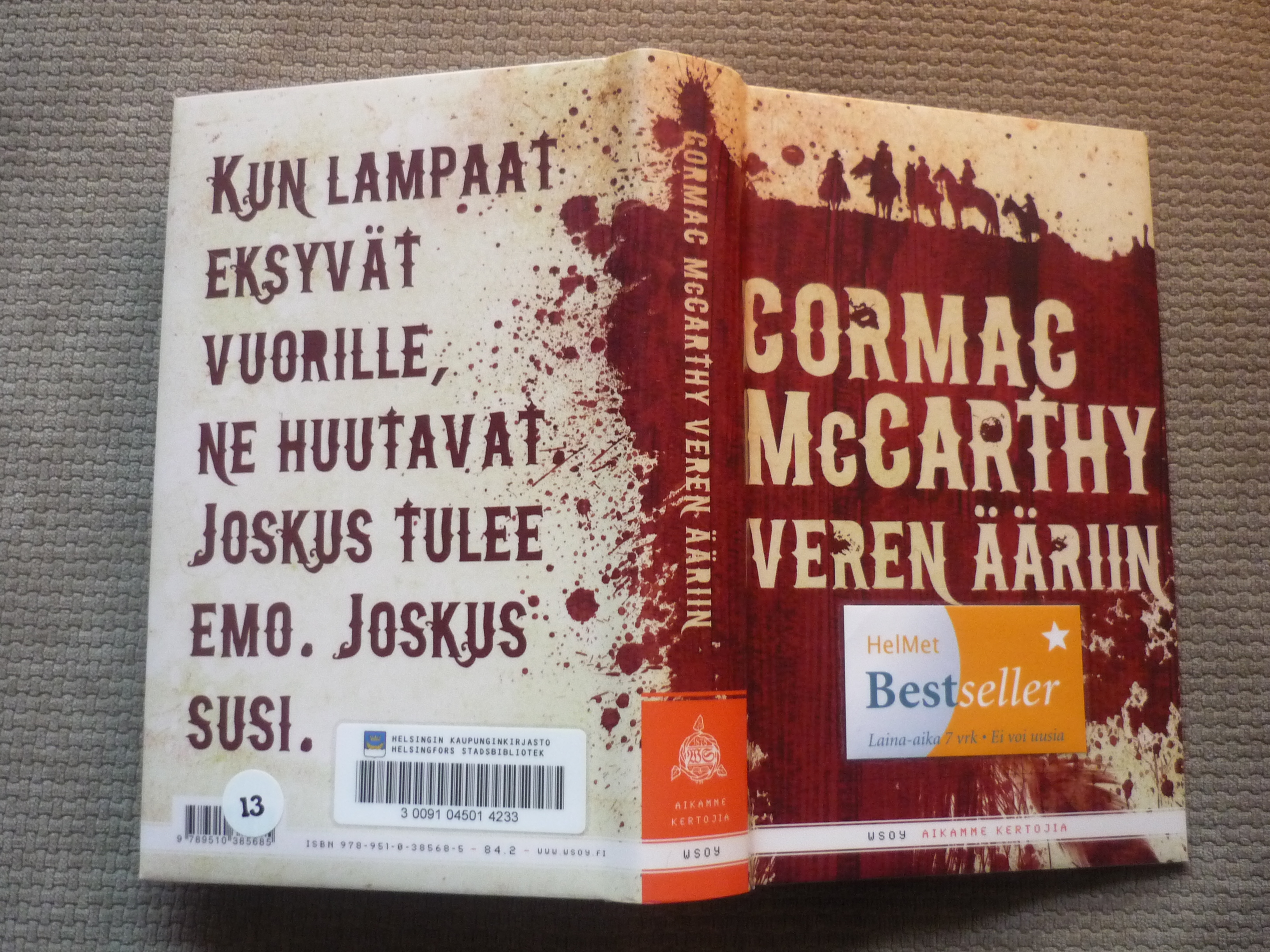 Tai sitten vaikka Cormac McCarthyn Blood Meridianin tuoretta suomennosta. 1800-luvun puolivälin villiin länteen sijoittuva, veren vuodattamisen moninaisista mahdollisuuksista kertova western, joka on kirjoitettu omalakisella päälausetyylillä, on riittävän kaukana kodista ollakseen sekoittamatta minua.