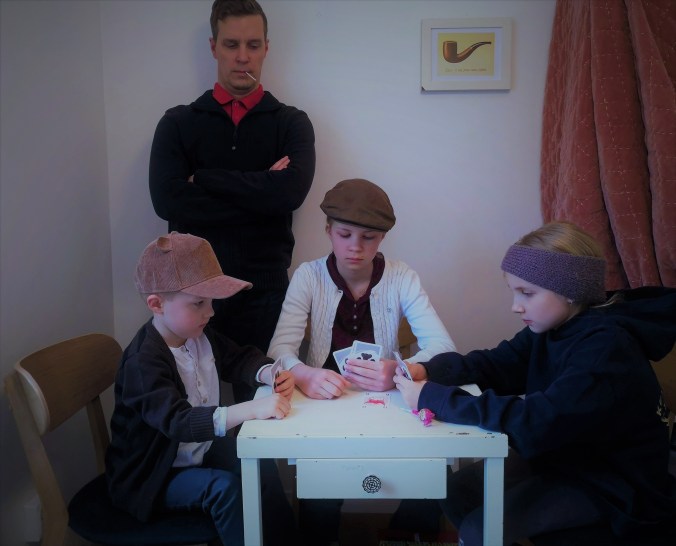 Poika suostuu vasta nyt askartelemaan äitille kortin ja lahjan, kun muillakin on. Nyt hän on sen tekemisestä jo innoissaan. Teemme piirustuksen, jossa pahis kaappaa äidin mutta sheriffi pelastaa. Sheriffi on hän, pahis isi. Sitten kuvaan pitää lisätä kiltti perhonen, kaunis kukka ja sydän.